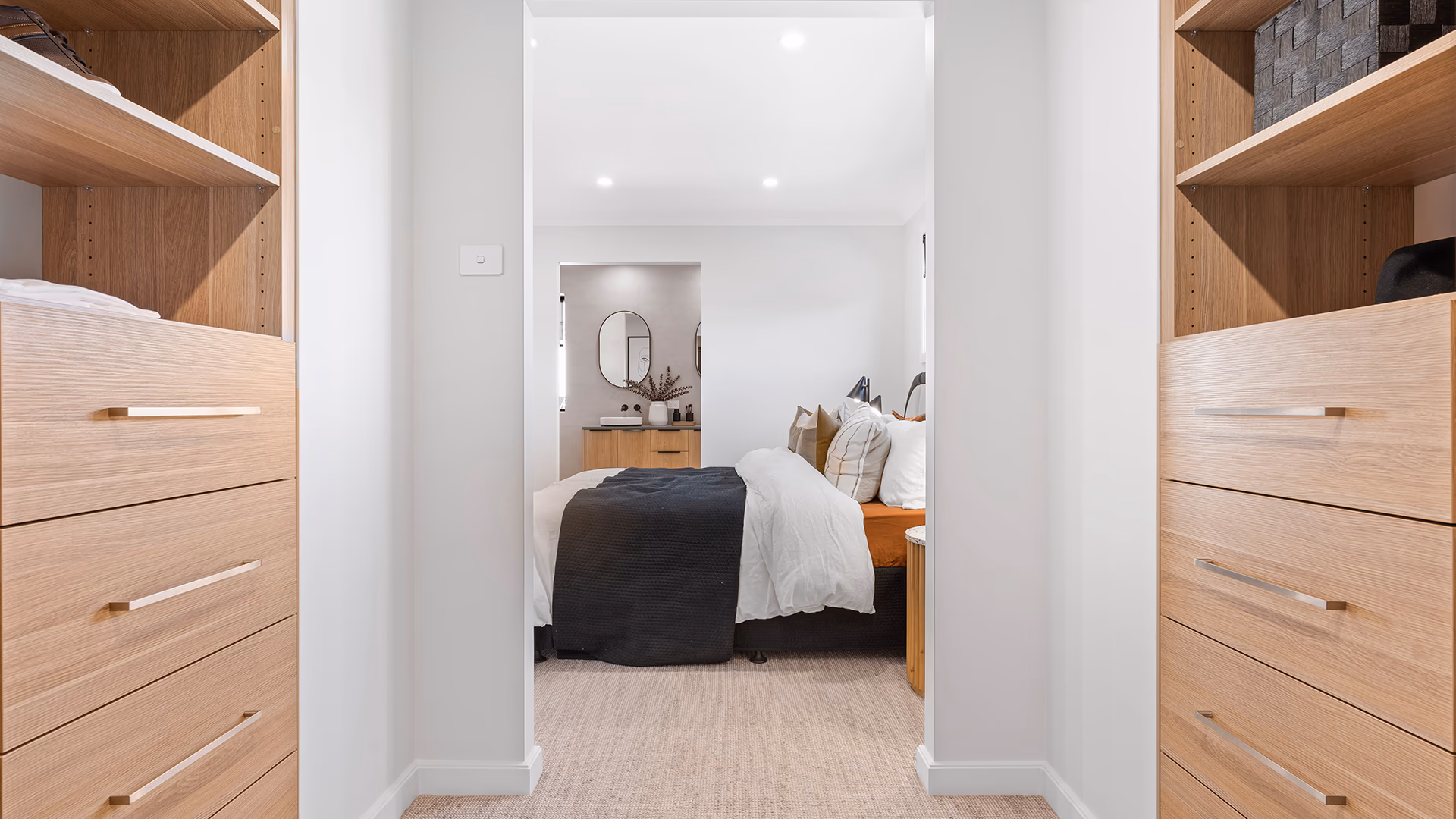 Designed for both comfort and style, the bedroom features a soft neutral wool carpet that adds warmth and texture while complementing the home's modern aesthetic. Thoughtfully selected décor and furnishings enhance the serene atmosphere, balancing contemporary contrasts with subtle touches of colour to create a welcoming and elegant retreat.