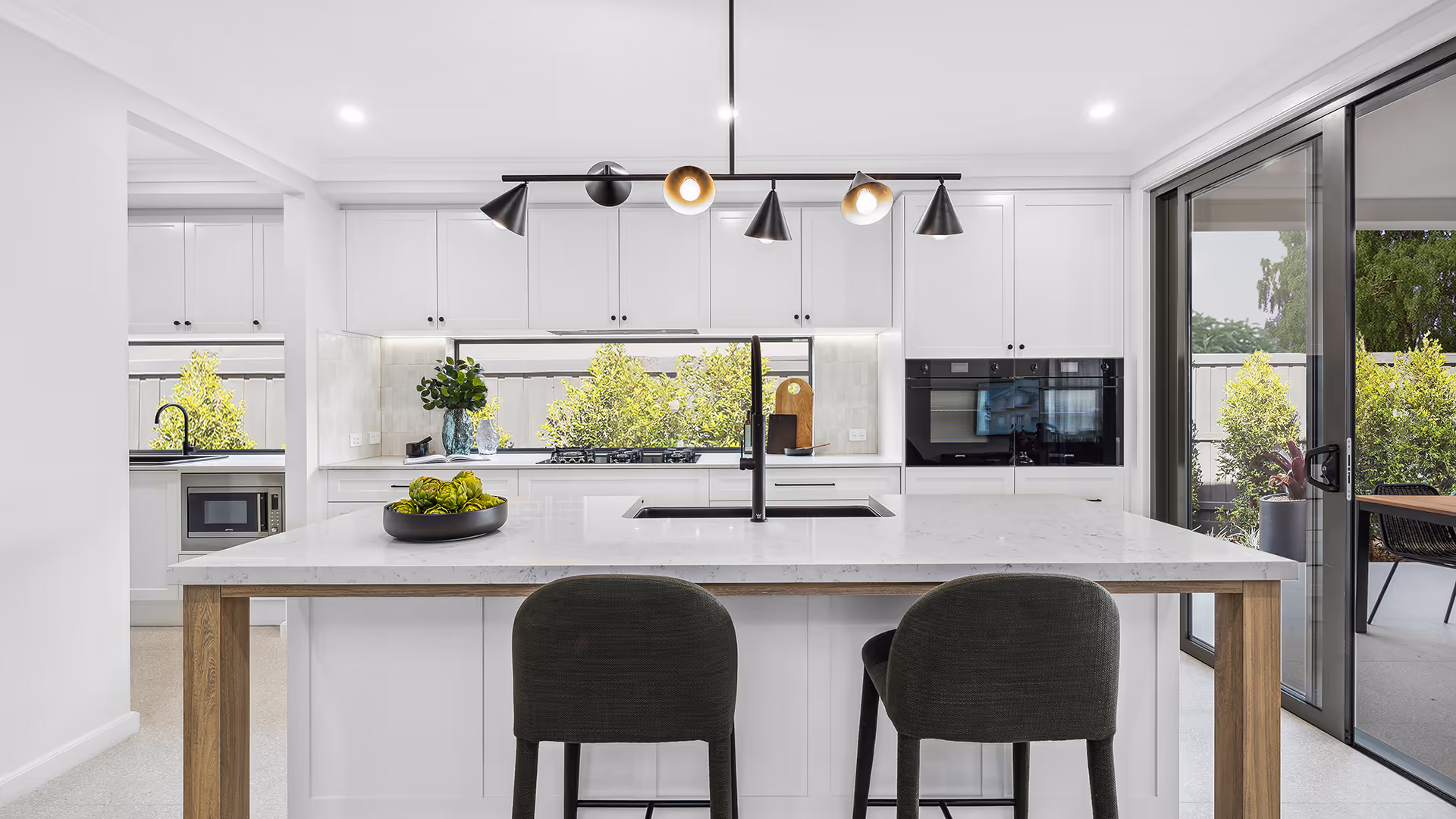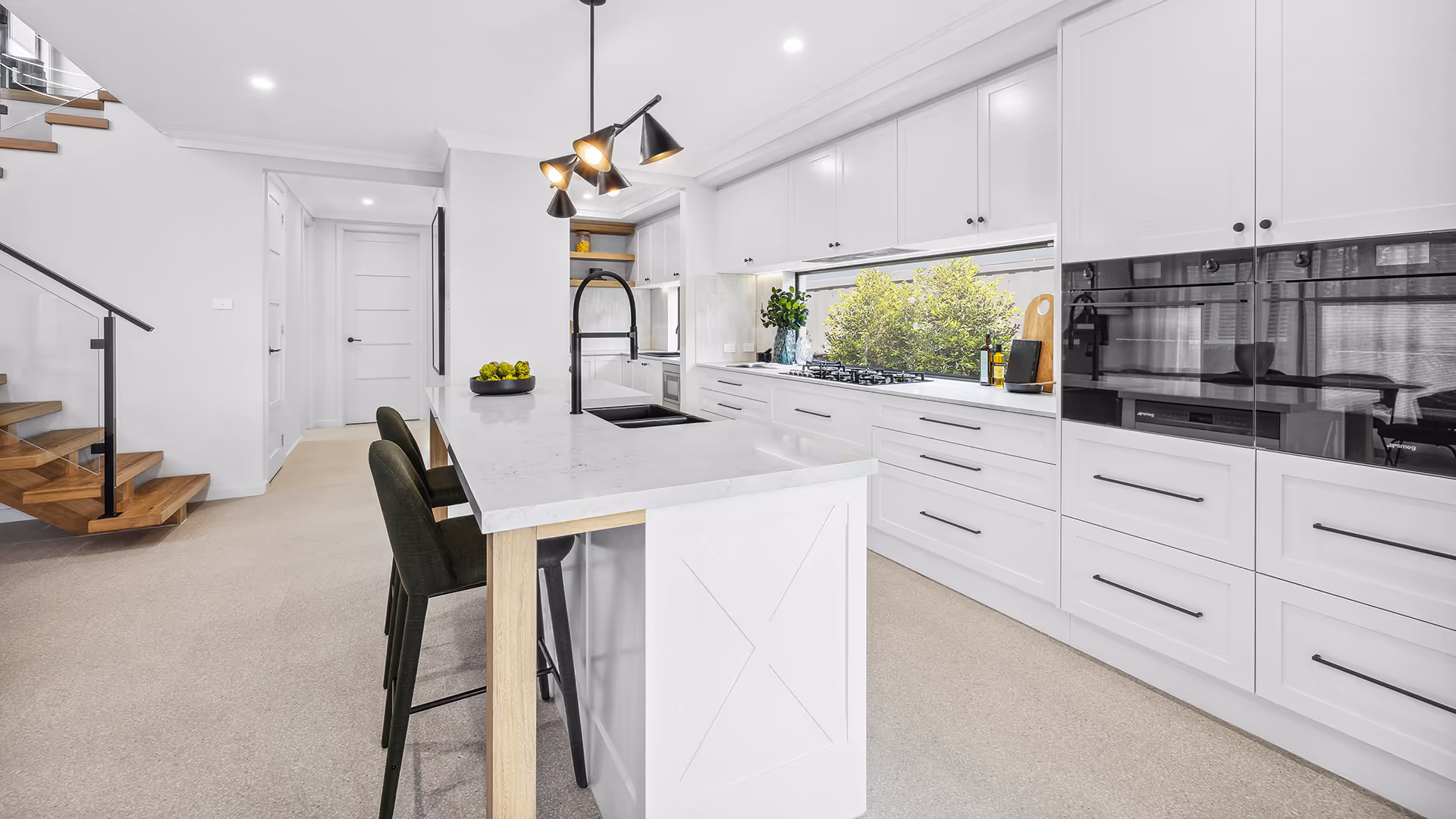 The kitchen embodies a modern minimalist aesthetic with a sleek combination of white shaker joinery, matte black accessories, and appliances, creating a clean and sophisticated space. Warm timber accents, seamlessly integrated into the island legs and staircase, add depth and contrast, reinforcing the balance between simplicity and warmth in the design.