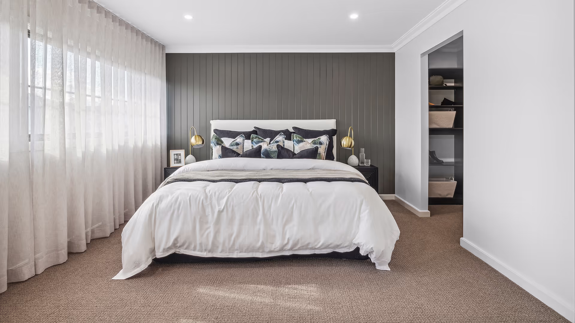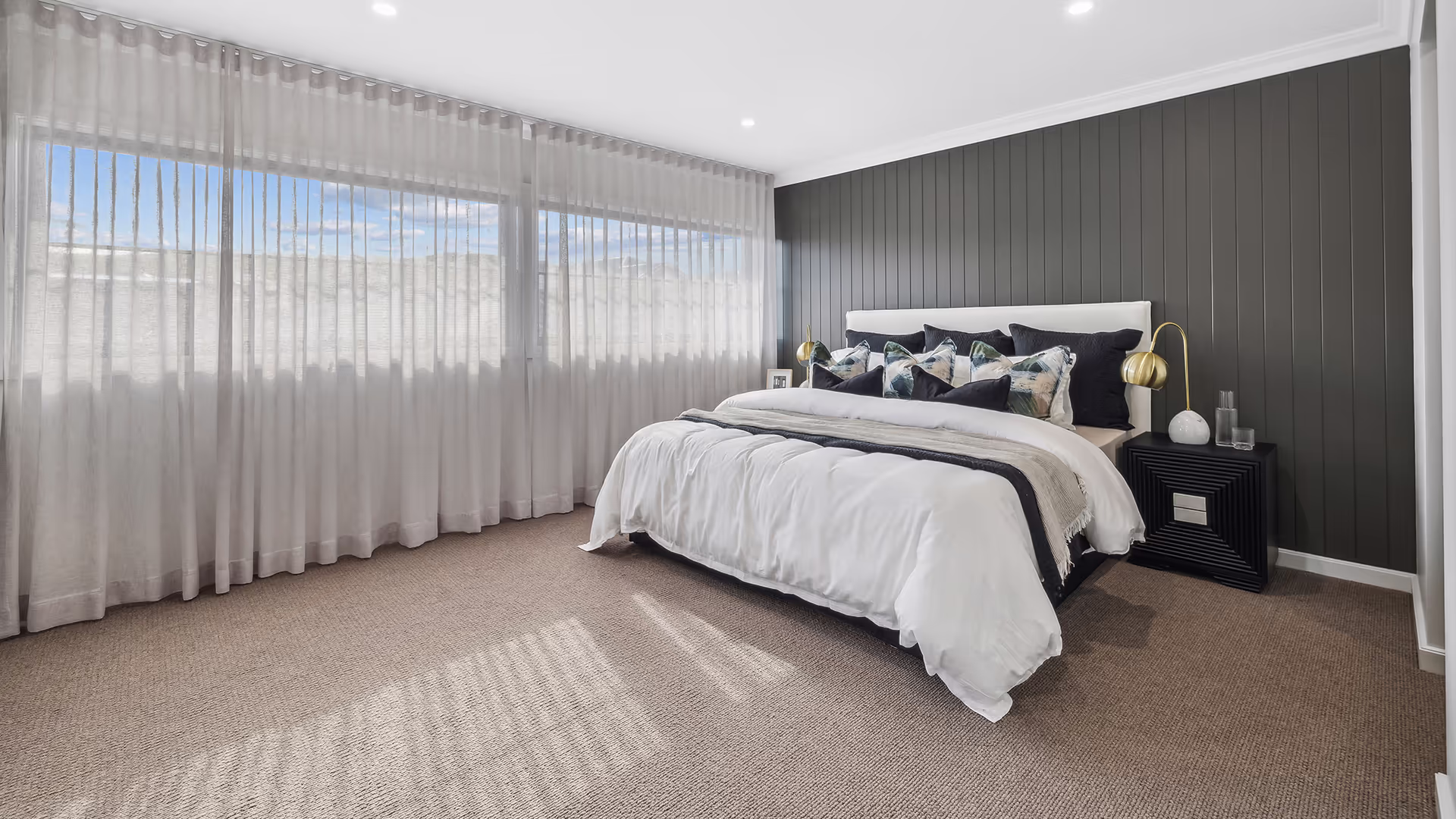 The bedrooms in the Savoy home embrace modern minimalist design with a soft, neutral color palette that enhances warmth and tranquility. Thoughtfully selected carpeting, timber accents, and clean-lined furnishings contribute to a clutter-free yet inviting atmosphere, ensuring a balance of comfort and sophistication.