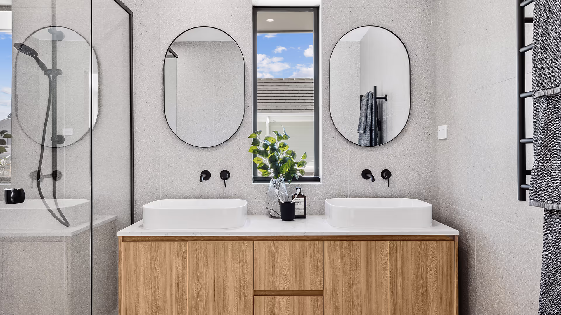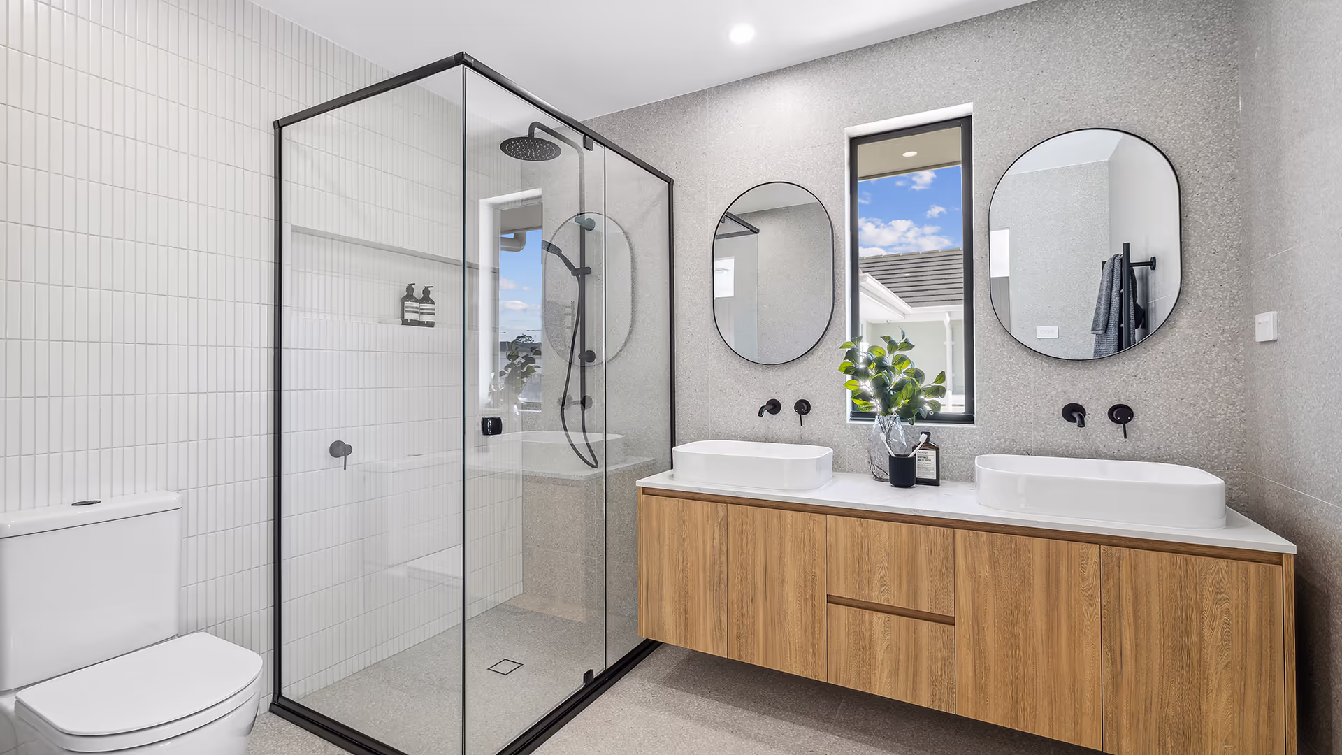 The bathroom design embraces modern minimalism with a sleek palette of satin white walls, soft terrazzo-style flooring, and contrasting matte black fixtures for a refined yet striking look. Timber tones add warmth, complementing the clean-lined aesthetic while maintaining a clutter-free and elegant space.
