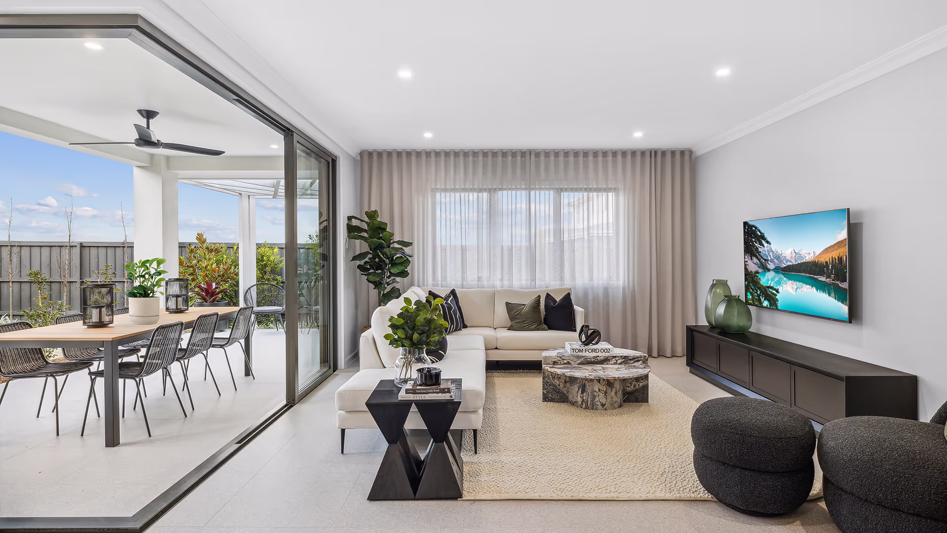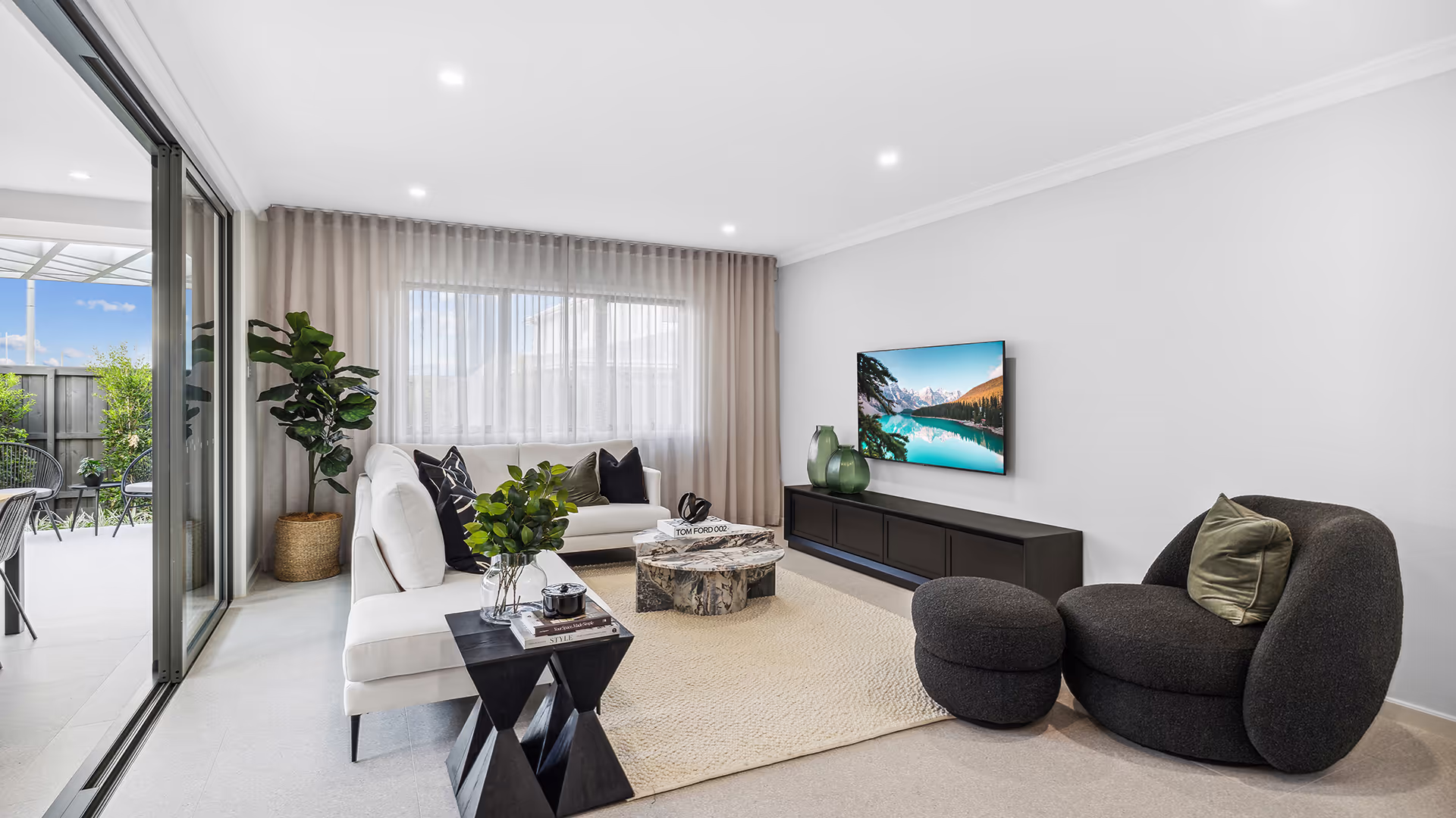 - Sheer curtains soften the space, balancing the contrast with matte black fixtures.
